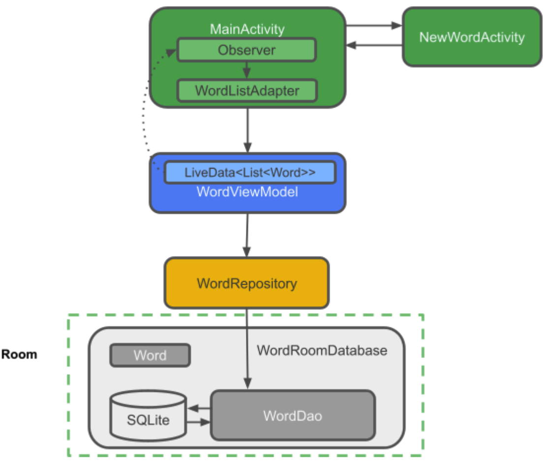 repository는 AAC의 일부는 아니지만 아키텍처를 위해 권장되는 구조이다. repository는 여러 DataSource 접근을 결정한다. 네트워크를 위한 DataSrource를 이용하여 데이터를 받을지, 로컬 DB에 캐시된값을 받아올지 등에 대한 결정로직들이 들어감
