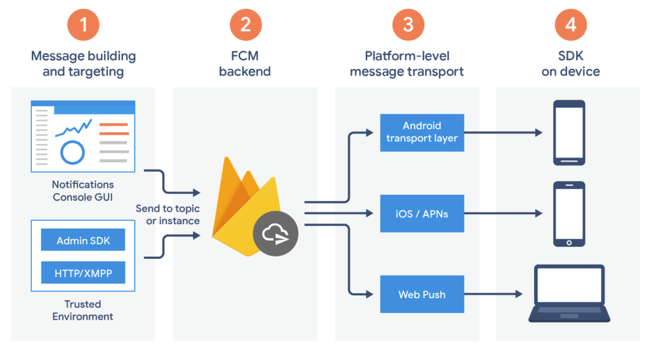- 각다른 플렛폼별 기기로 메시지 라우팅, 필요한 경우 플랫폼별 처리 등