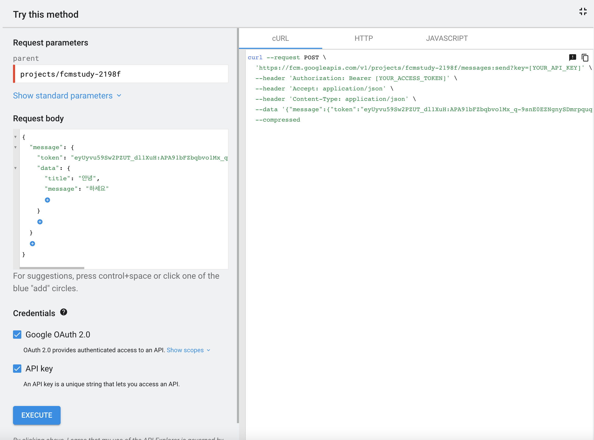 - EXECUTE 누르면 FirebaseMessageingService의 onMessageReceived로 메시지 들어온다.